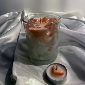 این شمع در یک لیوان کلاسیک، به صورت لایه‌لایه ساخته شده تا ظاهر یک لاته توت‌فرنگی را کاملاً شبیه‌سازی کند. از لایه شیری در پایین، تا ترکیب مرمرین و زیبای صورتی و سفید در بدنه و در نهایت، رویه‌ای که کاملاً شبیه به خامه زده‌شده با تکه‌های کوچک توت‌فرنگی است؛ تمام جزئیات با ترکیبی از وکس سویا و ژله‌ای با ظرافت تمام خلق شده‌اند.